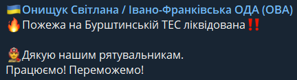 Позже Онищук добавила, что пожар на Бурштынской ТЭС ликвидирован.