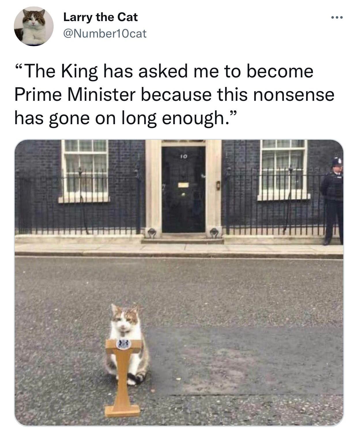 В твиттере кота Ларри из офиса премьера на Даунинг-стрит опубликовали шутку: "Король попросил меня стать премьер-министром, потому что эта ерунда продолжается уже достаточно долго".