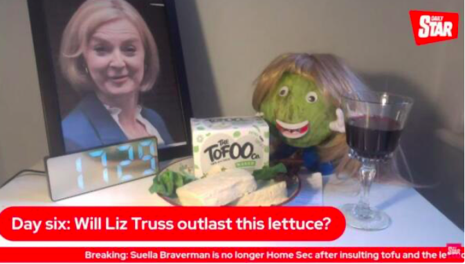 Британский таблоид Daily Star воплотил в жизнь метафору газеты, запустив на ютубе перфоманс с фото премьер-министра и кочаном салата. Издание назвало трансляцию "Сможет ли Лиз Трасс пережить латук?". На седьмой день спор разрешился - Трасс объявила об отставке, а салат отпраздновал победу над "соперницей".