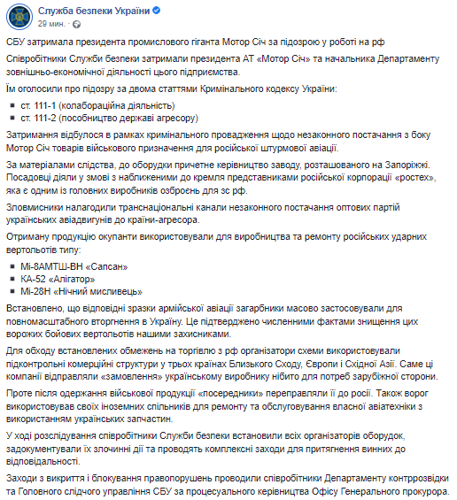 Задержание произошло в рамках дела по незаконной поставке со стороны "Мотор Сичи" товаров военного назначения для российской штурмовой авиации. По материалам следствия, к сделке причастно руководство завода, расположенного в Запорожье. Чиновники действовали в сговоре с приближенными к Кремлю представителями российской корпорации "Ростех", которая является одним из главных производителей вооружений для России.