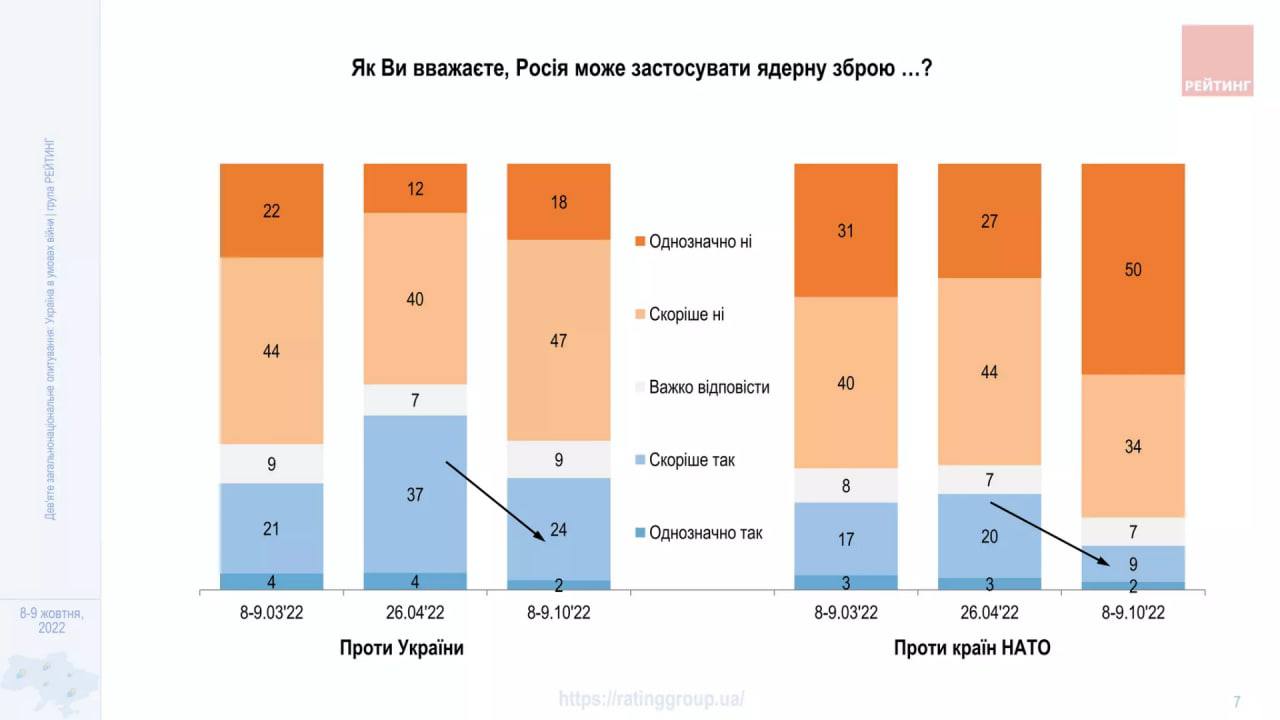 Число тех, кто считает вероятным ядерный удар по Украине и странам НАТО снизилось на 15% и 12% соответственно.