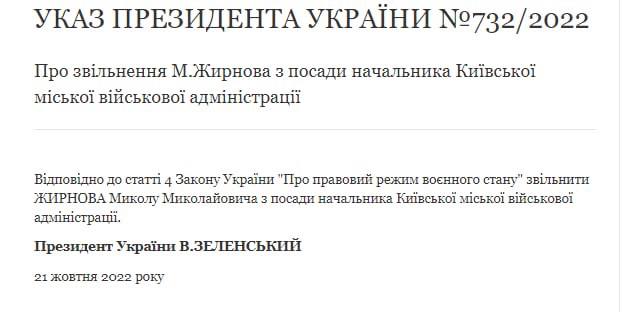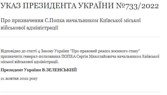 Президент Владимир Зеленский снял с поста главы Киевской городской военной администрации Николая Жирнова и назначил на этот пост генерал-полковника Сергея Попко, экс-командующего Сухопутными войсками ВСУ (в 2016-2019 годах).