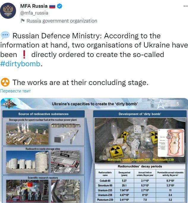Ранее в Минобороны РФ заявили, что Украина якобы планирует подорвать маломощный ядерный боеприпас, чтобы обвинить РФ в применении оружия массового уничтожения.