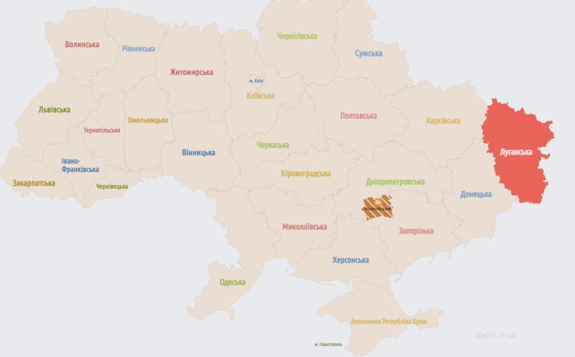 06.30 Карта тревог на сейчас. Тихо, кроме Луганской области. В Никопольском районе Днепропетровской области - угроза артобстрелов.