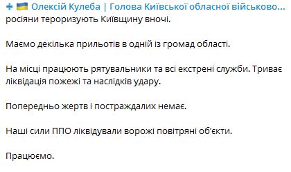 "На месте работают спасатели и экстренные службы. Продолжается ликвидация пожара и последствий удара. Предварительно жертв и пострадавших нет", - пишет глава Киевской ОВА Алексей Кулеба.