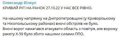 "Ночью враг пытался атаковать область с воздуха, но вражеская ракета Х-59 была сбита нашими силами ПВО" - сообщил глава Кривого Рога Александр Вилкул.