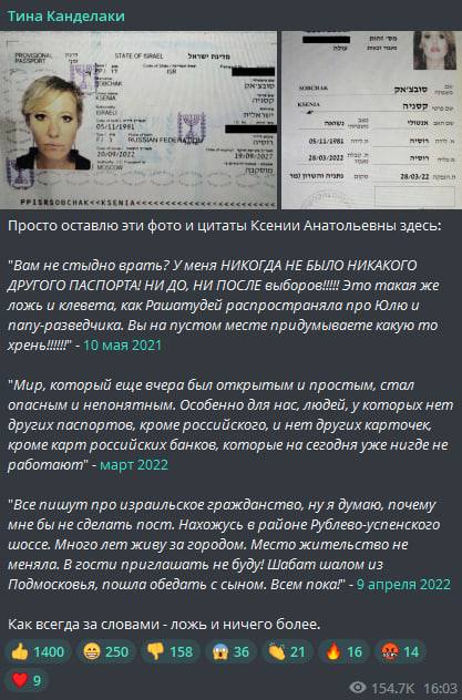 Телеведущая Тина Канделаки опубликовала фото израильского паспорта Ксении Собчак
