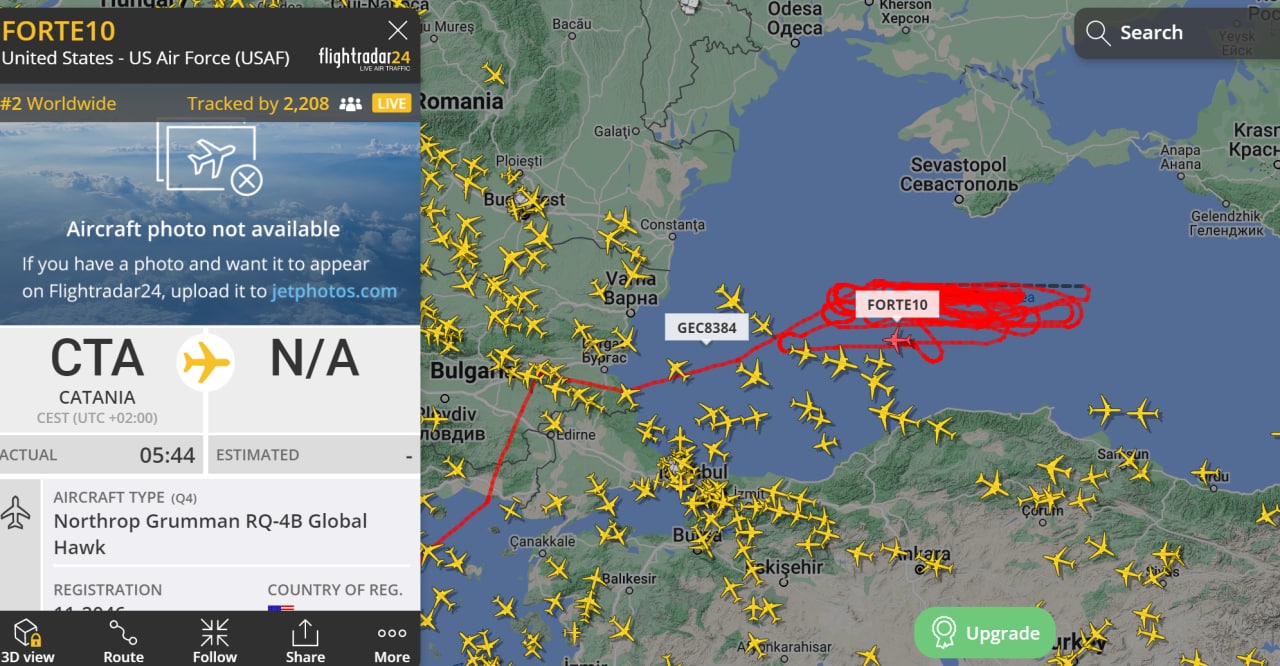 09.10 Над Черным морем делает круги американский разведывательный беспилотник RQ-4B Global Hawk. Это видно по сервису Flightradar.
