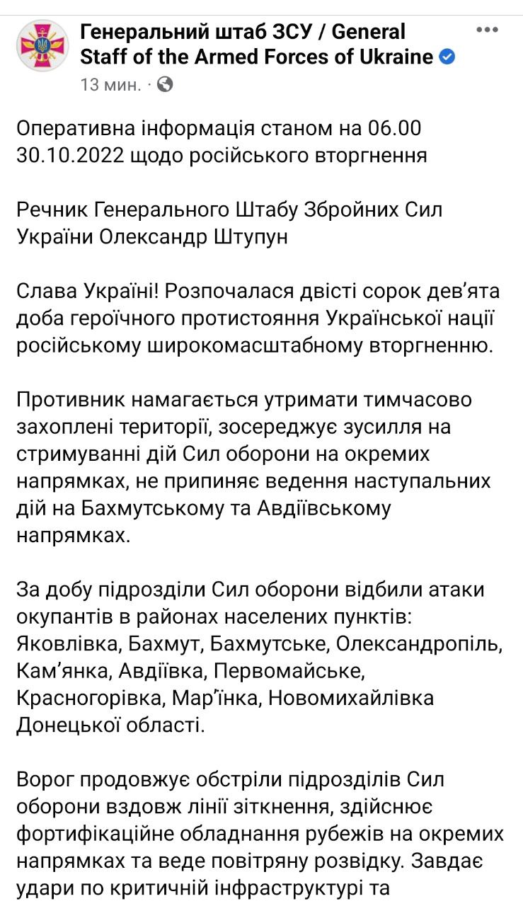 Генштаб ВСУ публикует оперативное обновление по вторжению России на 06.00 30 октября в 249 день войны. Противник пытается удержать временно захваченные территории, концентрирует усилия на сдерживании действий Сил обороны на некоторых направлениях, при этом не прекращает наступательные действия в Бахмуте и Авдеевке.