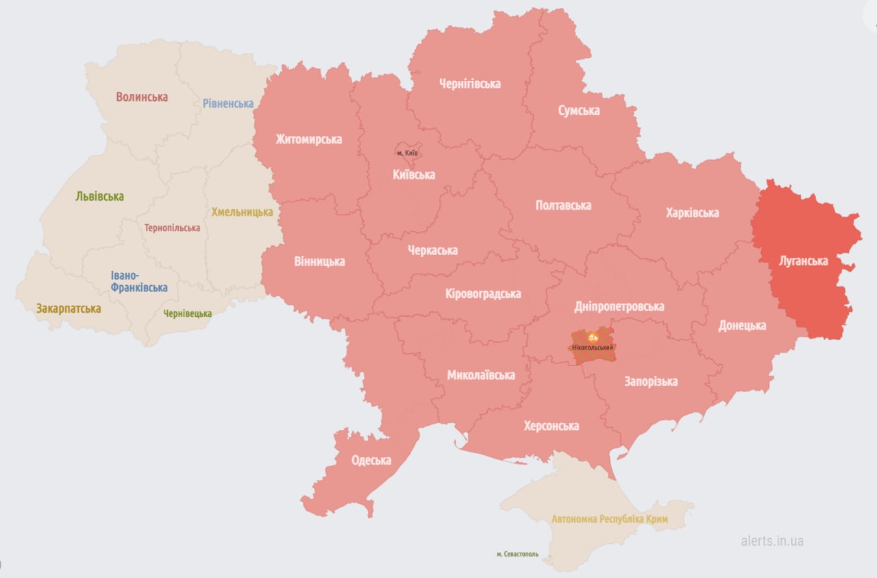 7.18 Карта воздушных тревог на это утро. Сирена практически везде, кроме западных областей.