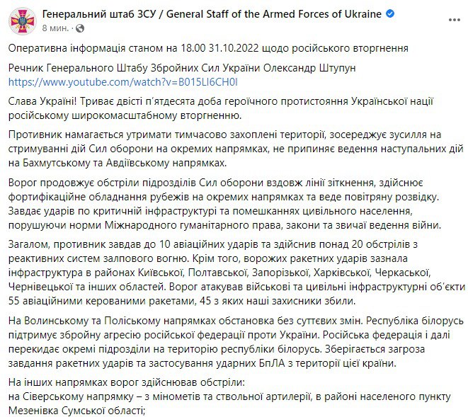 В понедельник, 31 октября, в Украине идет уже 250-й день войны с РФ.