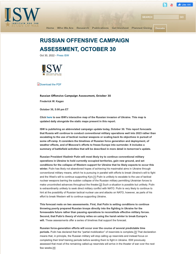 7.37 Американский "Институт изучения войны" полагает, что Россия продолжит проводить обычные военные операции вплоть до 2023 года, а применение тактического ядерного оружия на данный момент маловероятно.