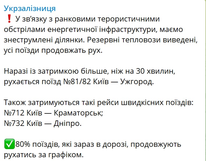 Из-за российских атак по энергетике часть железнодорожных веток обесточена. На маршруты вышли тепловозы.