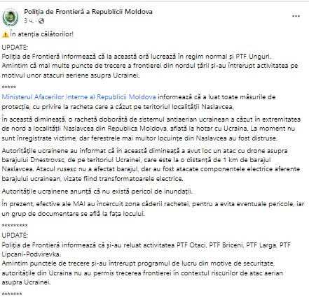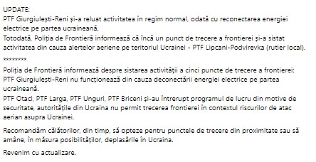 КПП в Атаках, Ларге, Унгурь, Бричанах приостановили свою работу из соображений безопасности.