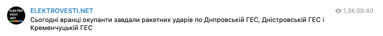 Профильное издание Еlektrovesti заявляет, что удары были нанесены по Днепровской, Днестровской и Кременчугской ГЭС.
