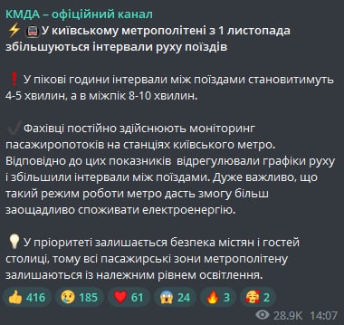 "Специалисты постоянно осуществляют мониторинг пассажиропотоков на станциях киевского метро. В соответствии с этими показателями отрегулировали графики движения и увеличили интервалы между поездами. Очень важно, что такой режим работы метро позволит более экономно потреблять электроэнергию", - говорится в сообщении КГГА.