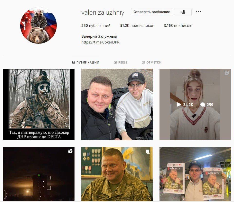 К слову, сегодня инстаграм-страницу главкома ВСУ Валерия Залужного взломали, разместив на аватарке фото Путина на медьведе, а в данных – ссылку на телеграм-канал "Джокер ДНР".