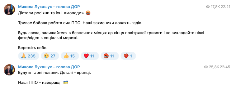 "Продолжается боевая работа сил ПВО. Наши защитники ловят гадов. Будут хорошие новости. Детали – утром. Наши ПВО – лучшие!", - написал Лукашук.