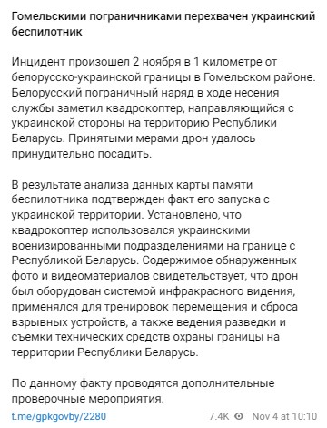 Минск утверждает, что дрон заметили еще на подлете из Украины и сумели принудительно посадить. Белорусы публикуют некие видео, якобы снятые этим дроном. На них беспилотник запускают военные с украинскими шевронами.