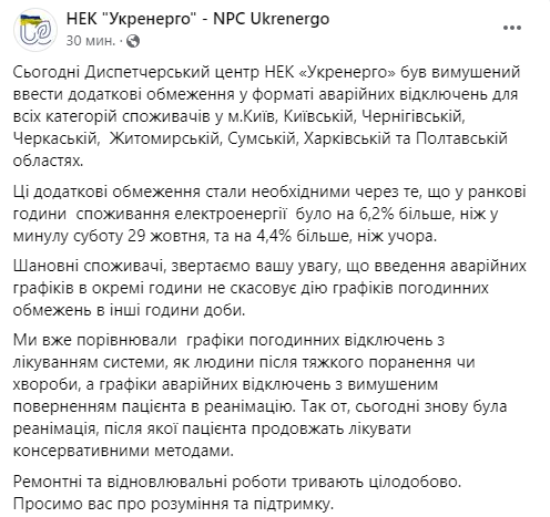 "Мы уже сравнивали графики почасовых отключений с лечением системы человека после тяжелого ранения или болезни, а графики аварийных отключений с вынужденным возвращением пациента в реанимацию. Так вот, сегодня снова была реанимация, после которой пациента продолжат лечить консервативными методами", - говорится в сообщении.