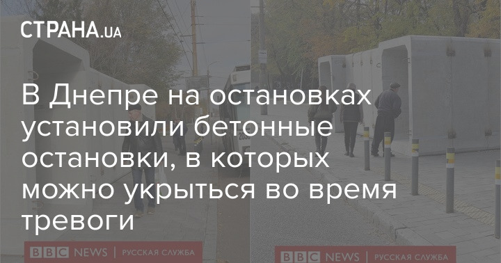 В Днепре установили бетонные остановки, внутри которых можно укрыться в случае воздушной тревоги. Толщина бетонных стенок - 25 см, потолка - 40 см. Вес конструкции - 70 тонн. Убежище рассчитано на 18 человек.