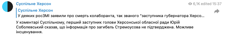 Первый заместитель председателя Херсонского областного совета Юрий Соболевский заявил, что информация о гибели Кирилла Стремоусова пока не подтверждена.