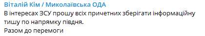 "В интересах ВСУ прошу всех причастных сохранять информационную тишину в направлении юга. Вместе к победе", - говорится в посте Кима.