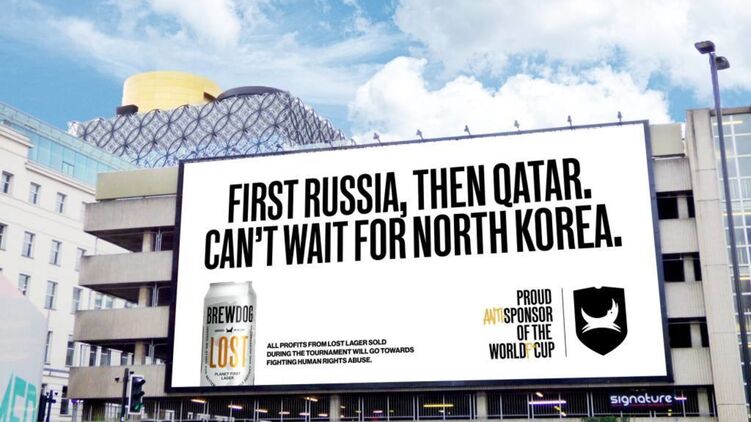 Британская сеть пабов BrewDog объявила себя "гордым антиспонсором" Чемпионата мира по футболу в Катаре, который начнется в ноябре. Она разместила провокационную серию билбордов, протестуя против притеснений прав человека в этой стране.