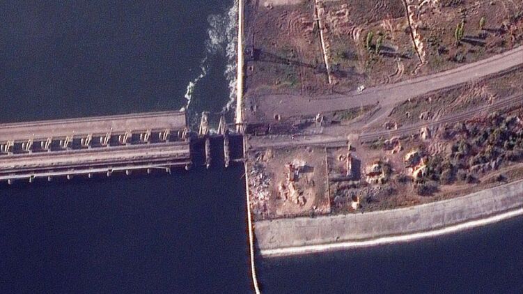 Новые повреждения на дамбе Каховской ГЭС. Снимок Maxar Technologies