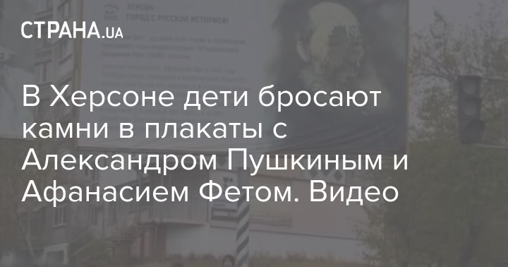 В сети появилось видео, как дети в Херсоне бросают камни в плакаты с русскими поэтами Александром Пушкиным и Афанасием Фетом.
