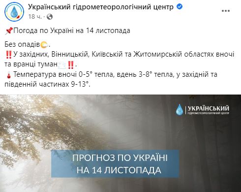 В понедельник, 14 ноября, в Украине будет погода без осадков.