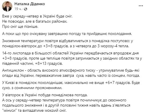 Синоптик Наталья Диденко пишет, что на этой неделе уже в среду-четверг в некоторых районах пойдет снег. С понедельника будет происходить постепенное снижение температуры. В понедельник-вторник до +3...+8 градусов, а с четверга до -3.