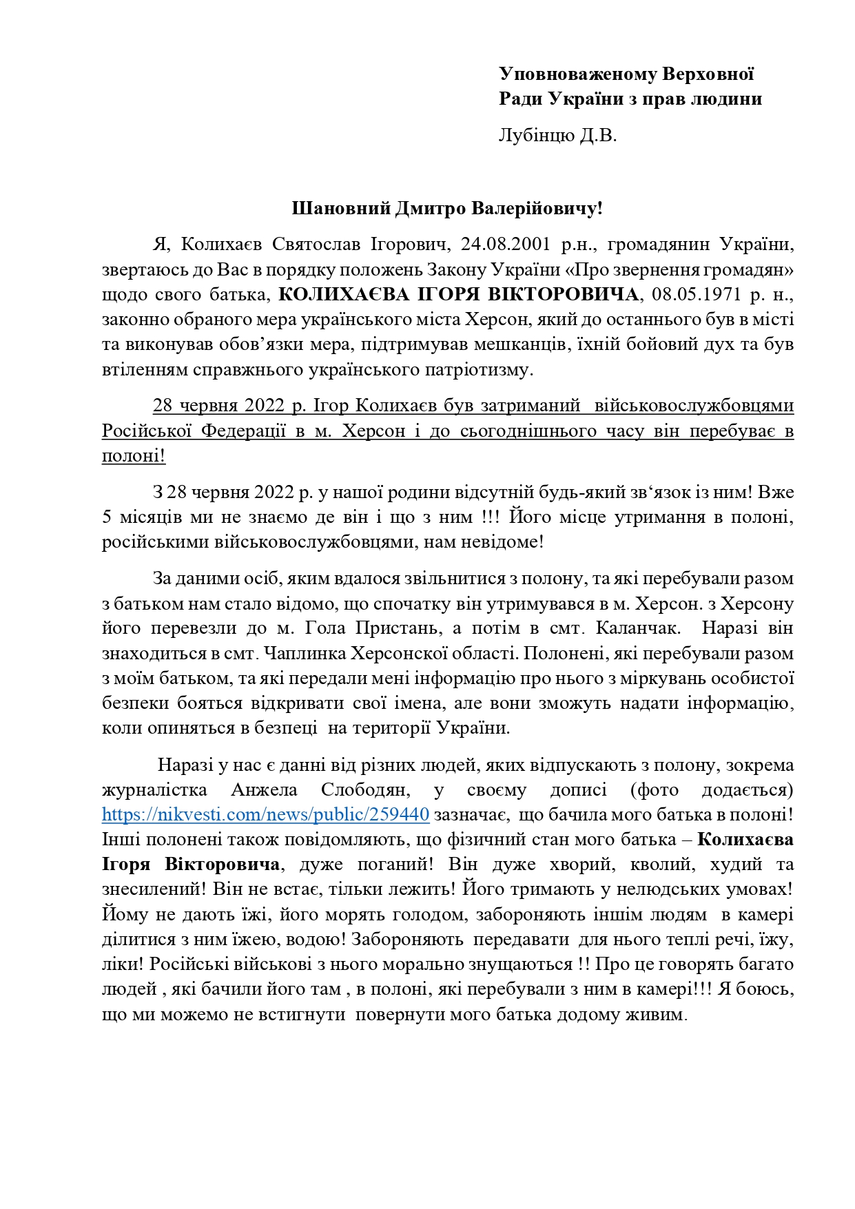 В своем обращении к уполномоченному Верховной Рады по правам человека он призывает привлечь к освобождению Колыхаева международные организации и включить мэра в список на обмен пленными.