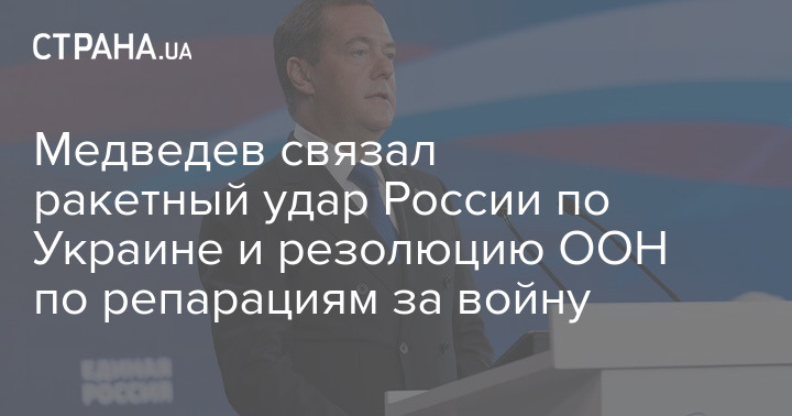 Зампред Совбеза РФ Медведев связал сегодняшний ракетный удар по Украине и вчерашнюю резолюцию ООН по репарациям с России.