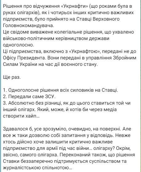 Подоляк заявил, что "решение об отчуждении "Укрнафты", как и четырех других критически важных предприятий, было принято на Ставке верховного главнокомандующего единогласно.