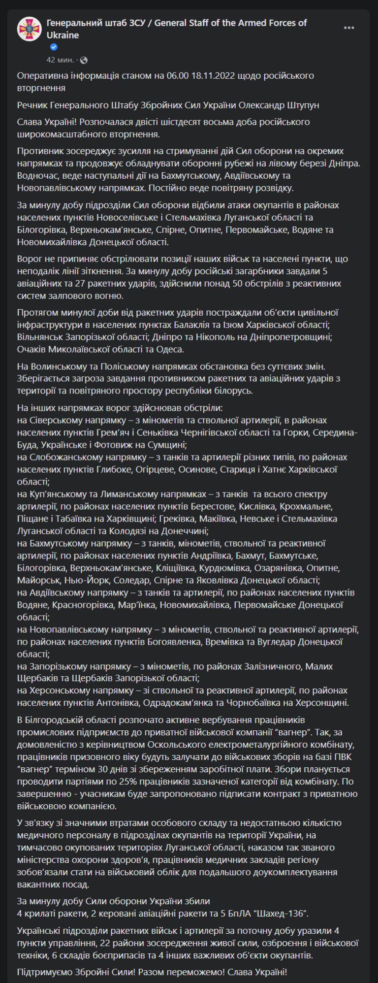 В пятницу, 18 ноября, идет уже 268-й день со дня полномасштабного вторжения РФ в Украину.