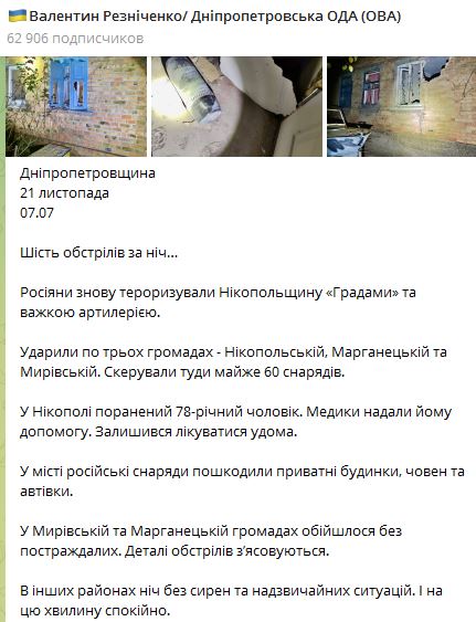 В Днепропетровской области за ночь 21 ноября было шесть обстрелов РФ.