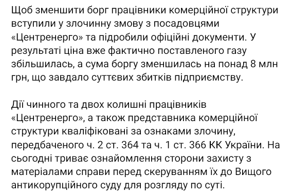 Действия действующего и двух бывших работников "Центрэнерго", а также представителя коммерческой структуры квалифицированы по признакам преступления, предусмотренного ч. 2 ст. 364 и ч. 1 ст. 366 УК Украины. Продолжается ознакомление стороны защиты с материалами дела перед направлением их в Высший антикоррупционный суд для рассмотрения по существу, добавили в САП.