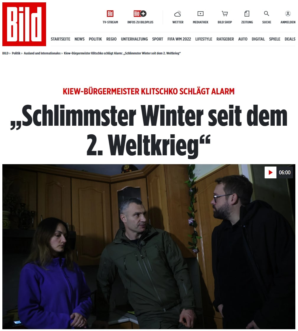 "Мое впечатление: люди станут только злее, решительнее. Мы не умрем и не убежим, как того хочет Путин", - добавил киевский градоначальник и призвал Германию срочно направить гуманитарную помощь - генераторы, теплую одежду и другие необходимые вещи в дополнение к вооружениям для обороны Украины.