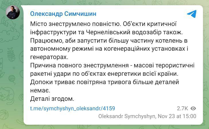 Ранее в Офисе президента заявили, что свет начнут восстанавливать с завтрашнего утра.