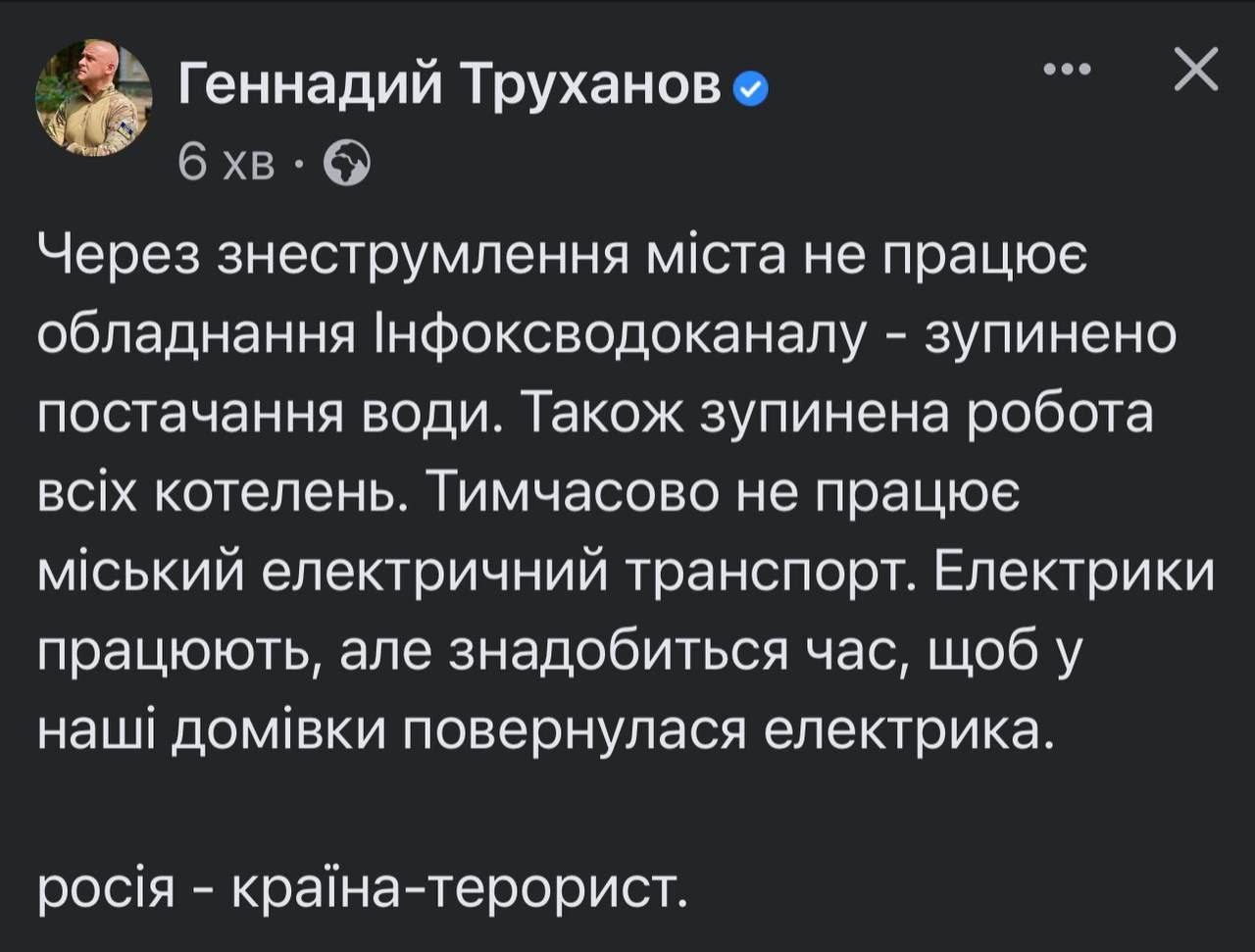 Вилкул говорит, что в ближайшие несколько часов попытаются восстановить электрику.