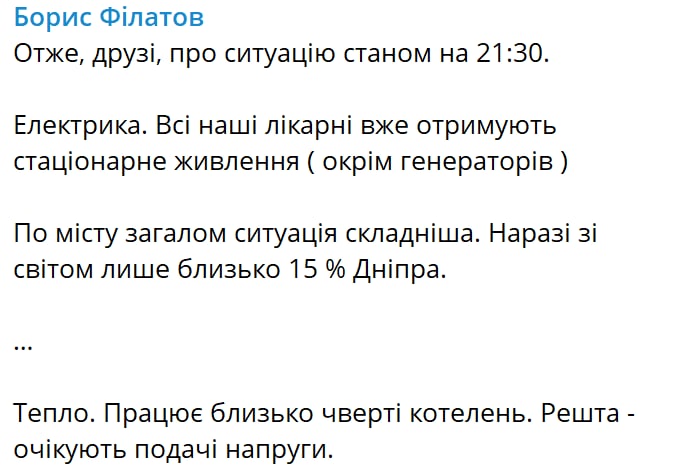 21:52 Днепре только 15% жителей со светом, сообщил мэр Борис Филатов.
