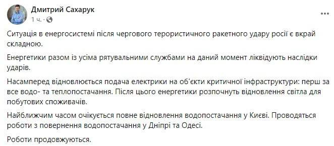 23:43 Ситуация в энергосистеме крайне сложна, пишет исполнительный директор ДТЭК Дмитрий Сахарук.