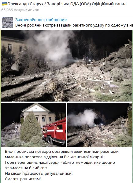 06.00 Ночью в Вольнянске Запорожской области РФ обстреляла родильное отделение больницы. Погиб новорожденный ребенок.