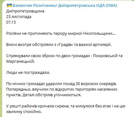Били по двум громадам - Покровской и Марганецкой. По ним было выпущено более 30 вражеских снарядов. Предварительно попали по открытым территориям населенных пунктов. Детали обстрелов уточняются. К счастью, люди не пострадали.