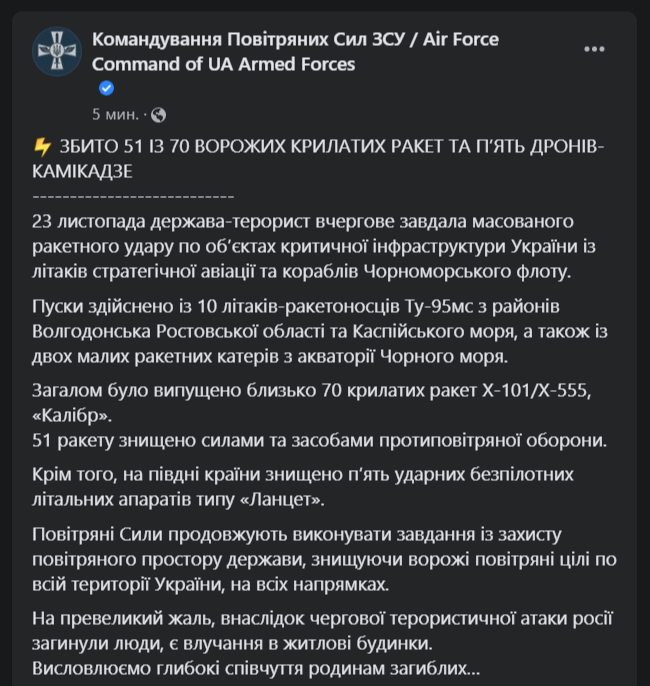 "Пуски осуществлены из 10 самолетов-ракетоносцев Ту-95мс из районов Волгодонска Ростовской области и Каспийского моря, а также двух малых ракетных катеров из акватории Черного моря. В общей сложности было выпущено около 70 крылатых ракет Х-101/Х-555, "Калибр". 51 ракета уничтожена силами и средствами противовоздушной обороны", - заявляет командование.