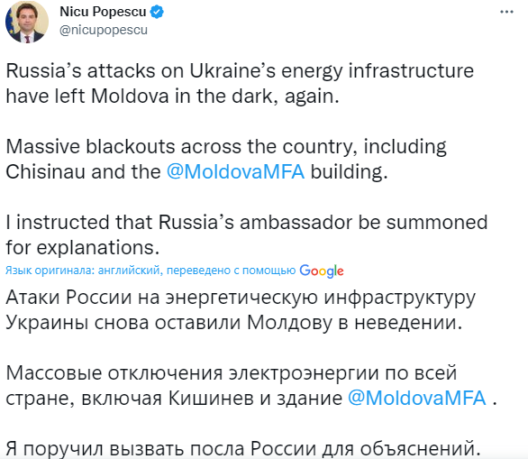 "Атаки России на энергетическую инфраструктуру Украины снова погрузили Молдову во тьму. Массовые отключения света по всей стране, включая Кишинев и здание МИД. Я дал поручение вызвать для объяснений посла России", - отметил он.