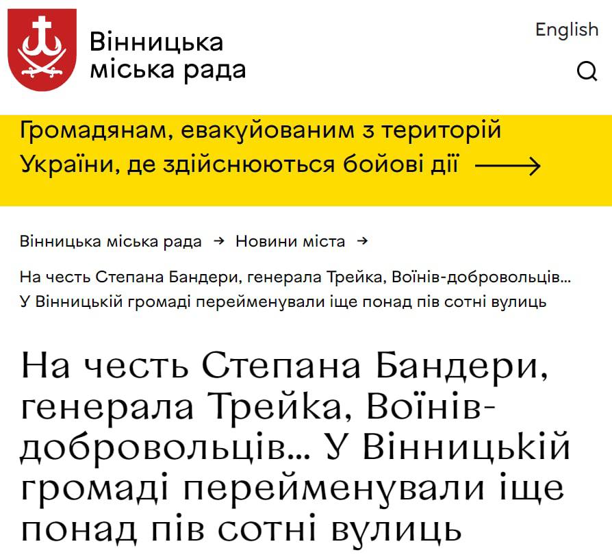 В Виннице дерусифицировали еще полсотни топонимов. Улицу Льва Толстого переименовали в честь Степана Бандеры