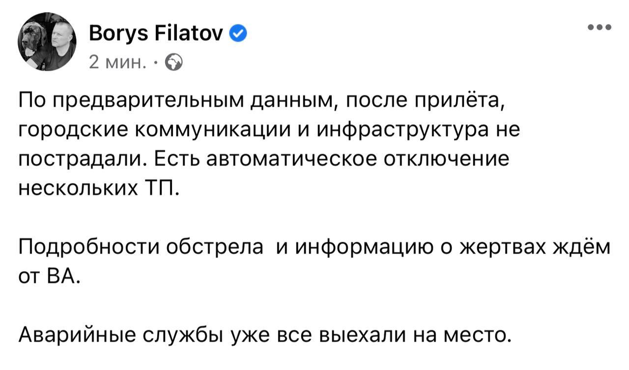 12.12 Мэр Днепра Филатов подтвердил первый удар по городу. Пишет об автоматическом отключении нескольких трансформаторных подстанций (ТП).