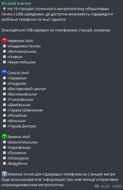 Он подчеркнул, что пункты обогрева – это не панацея, поэтому каждый киевлянин должен самостоятельно подготовиться к возможной чрезвычайной ситуации и позаботиться о запасах воды, еды, теплых вещей.